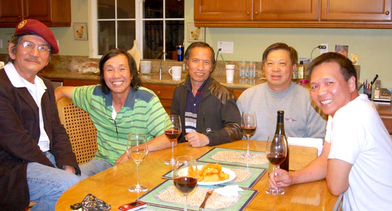Thằng ngồi đó là ai? Ờ, mày là Trần Văn Hải Hải Biệt Động Quân cùng ở tiểu đoàn 3 Mày về Châu Đốc! Còn mày? À, thằng Mỹ khùng đi nhảy dù thuở trước, Có thằng Cử ở đầu kia tiểu đoàn mấy hả mày? Thấy thằng nầy lại nhớ thằng kia Đang sống thực tại mà mơ về ngày cũ. Nè Tôn Thất Tuấn, Mạc Văn Văn Rần, Nguyễn Doãn Ngọc… mày nhớ không Trần Hữu Mỹ? Mày ở cùng tao 331 với Trần Bá Hiền, Huỳnh Văn Xen? Chết thiệt chớ chẳng chơi Thằng Hùng cụt kêu “uống giùm tao với” Ừ, thì một ly cho mày và một cho tao, Cho những thằng đã mất âm hao, Không còn nhìn thấy trên cõi trần ô trược. Tụi bay uống rượu mà như uống nước? Rượu Tây, rượu Mỹ hay nước mắt quê hương? Chảy ngược vào trong hay ướt đẫm hình hài? Rượu ngon không mày? Ừ cũng được.